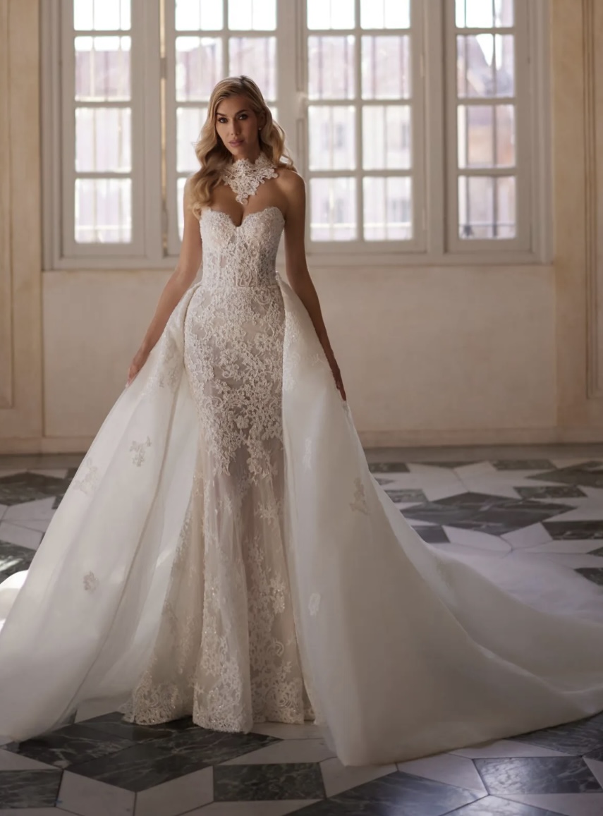 Ein Kleid – zwei atemberaubende Auftritte. Ein figurbetontes, enganliegendes Kleid wird für den grossen Auftritt durch einen voluminösen Rock mit langer Schleppe ergänzt.